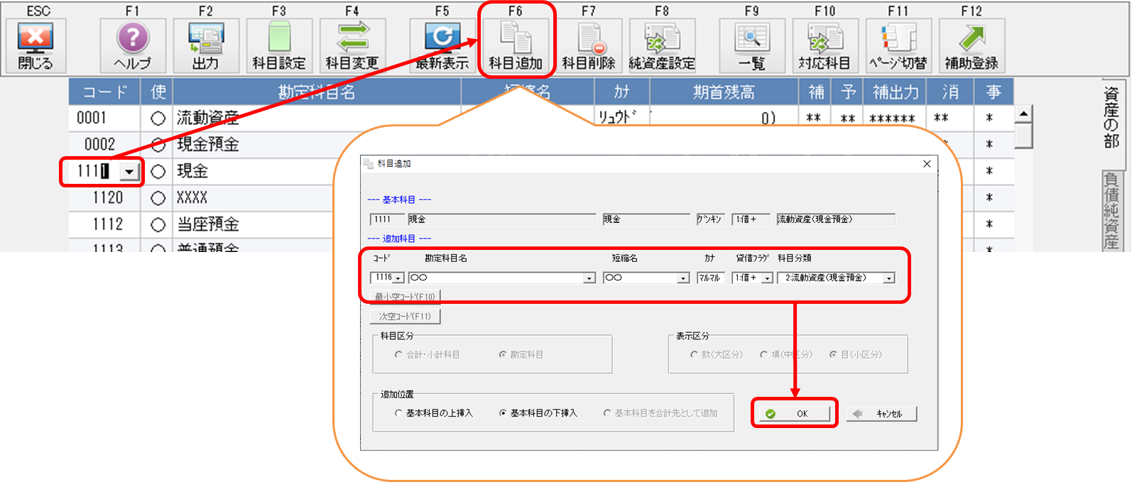 「1111:現金」をクリックし、F6[科目追加]をクリックすると、科目追加のウィンドウが表示されます。