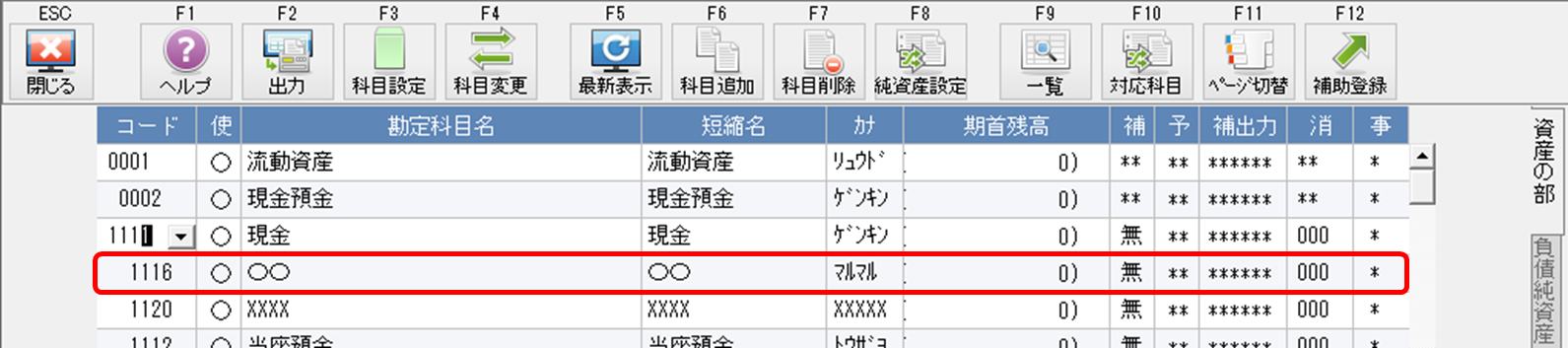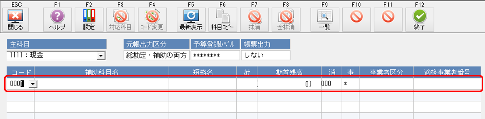「1111:現金」をクリックしている状態で、F4[科目追加]をクリックし「補助科目登録」を選択すると[補助科目登録]の画面に移ります。