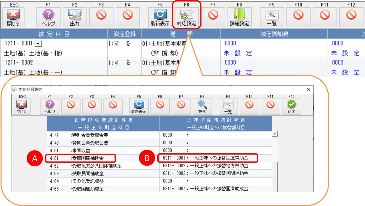 [減価償却科目設定]のF6[対応設定]で、Aに対して設定した正味財産増減計算書科目