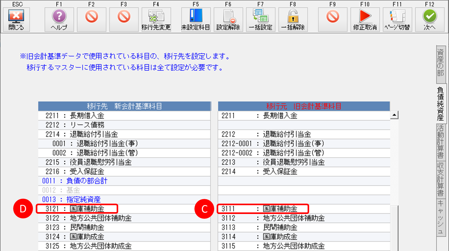 [資産登録]-F8[補助金等]で使用していた科目は、令和6年会計基準に移行すると、以下のABCDの順番で変更されます。