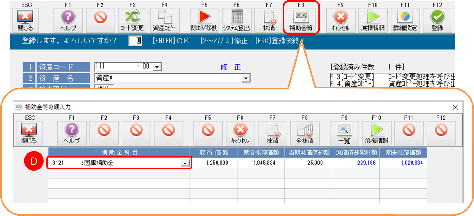 [資産登録]のF8[補助金等]