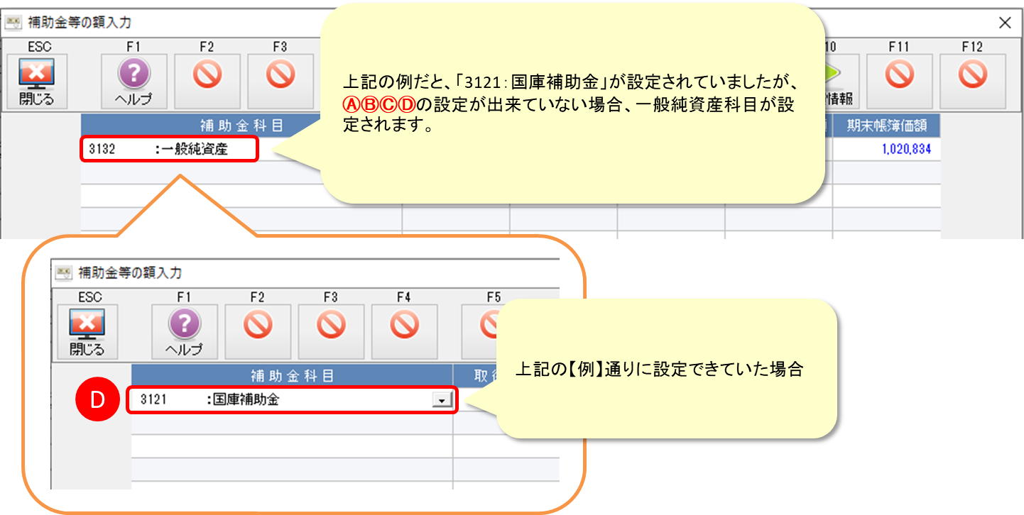 F8[補助金等]は二回目以降の移行処理でも更新されますので、下記のABCDの設定を確認し、[令和6年会計基準移行処理]をやり直してください。