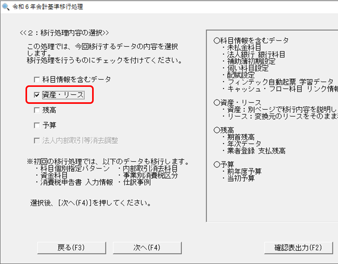 修正した内容を[資産登録]に反映させたい場合は、≪2:移行処理内容の選択≫で「資産・リース」にチェックを付けて更新を行ってください。